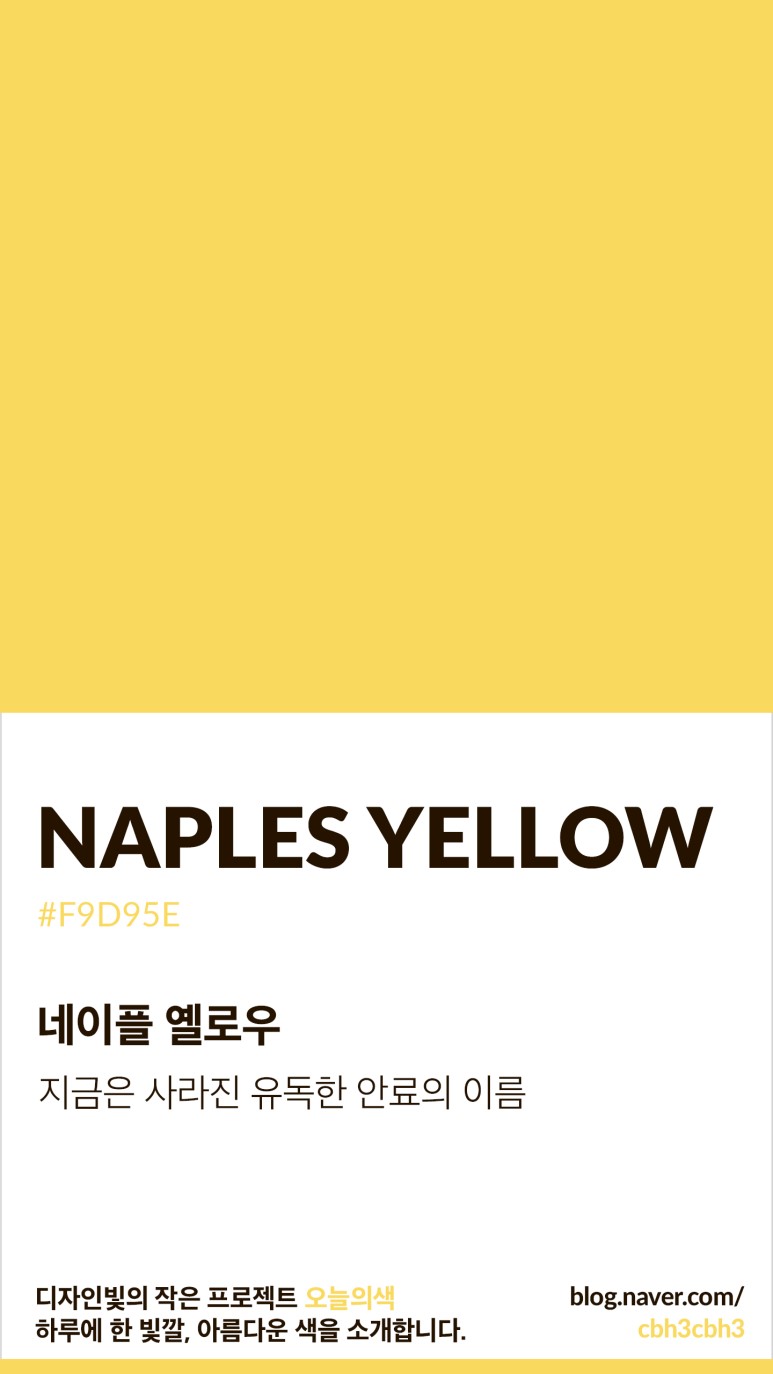 네이플스 옐로우 이전에 사용됐다고 말씀드린 납주석황색은 네이플스 옐로우보다 위험도가 더 높은 색인데요(...) 역사적으로 중요한 색이고 네이플스 옐로우만큼 스토리가 많으니 추후에 한번 소개해드릴 수 있도록 할게요! 그럼 네이플스 옐로우처럼 밝은 하루가 되길 바라며 오늘의 색을 마칩니닷.