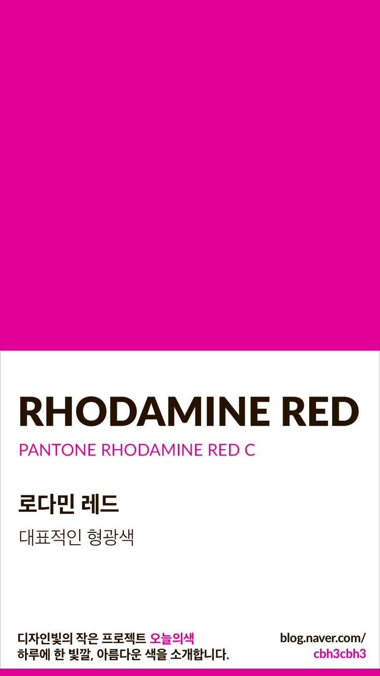 오늘의 색 이미지에 사용한 색은 팬톤의 로다민 레드인데, 형광핑크색을 응축시켜놓은 듯한 진한 색입니다. 로다민은 말라카이트 그린과 비슷하게 염료로는 훌륭하지만 유독성 발암물질이라서 사람이 먹는 것에 사용하면 절대 안돼요. 하지만 한때 과자나 장아찌에 로다민을 착색료로 사용한 적이 있다고 합니다......