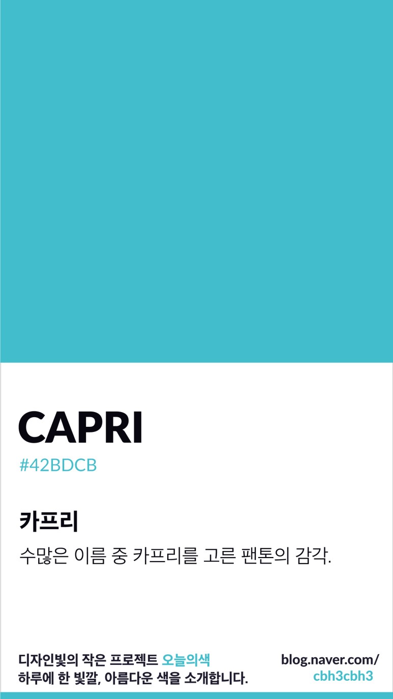 디자인빛이 소개해 드릴 오늘의색은 '카프리capri/pantone 15-4722 TCX'입니다. 정말 아름답고 청량한 파랑이죠!