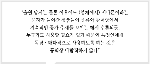 태평양은 시나몬이 상표의 기능을 할 것이라 보았는데, 특허청은 안된다고 상표등록을 반려했습니다. 이후 태평양이 다시 소송을 냈지만 패소했어요.